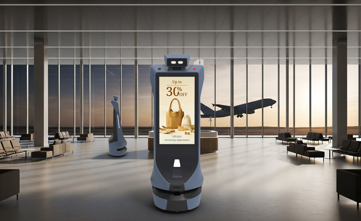 An advertising robot for airports like Odigo is a smart, mobile unit designed to display targeted promotions while guiding travelers. Odigo increases brand visibility, boosts foot traffic to airport retail, and supports smooth passenger movement.