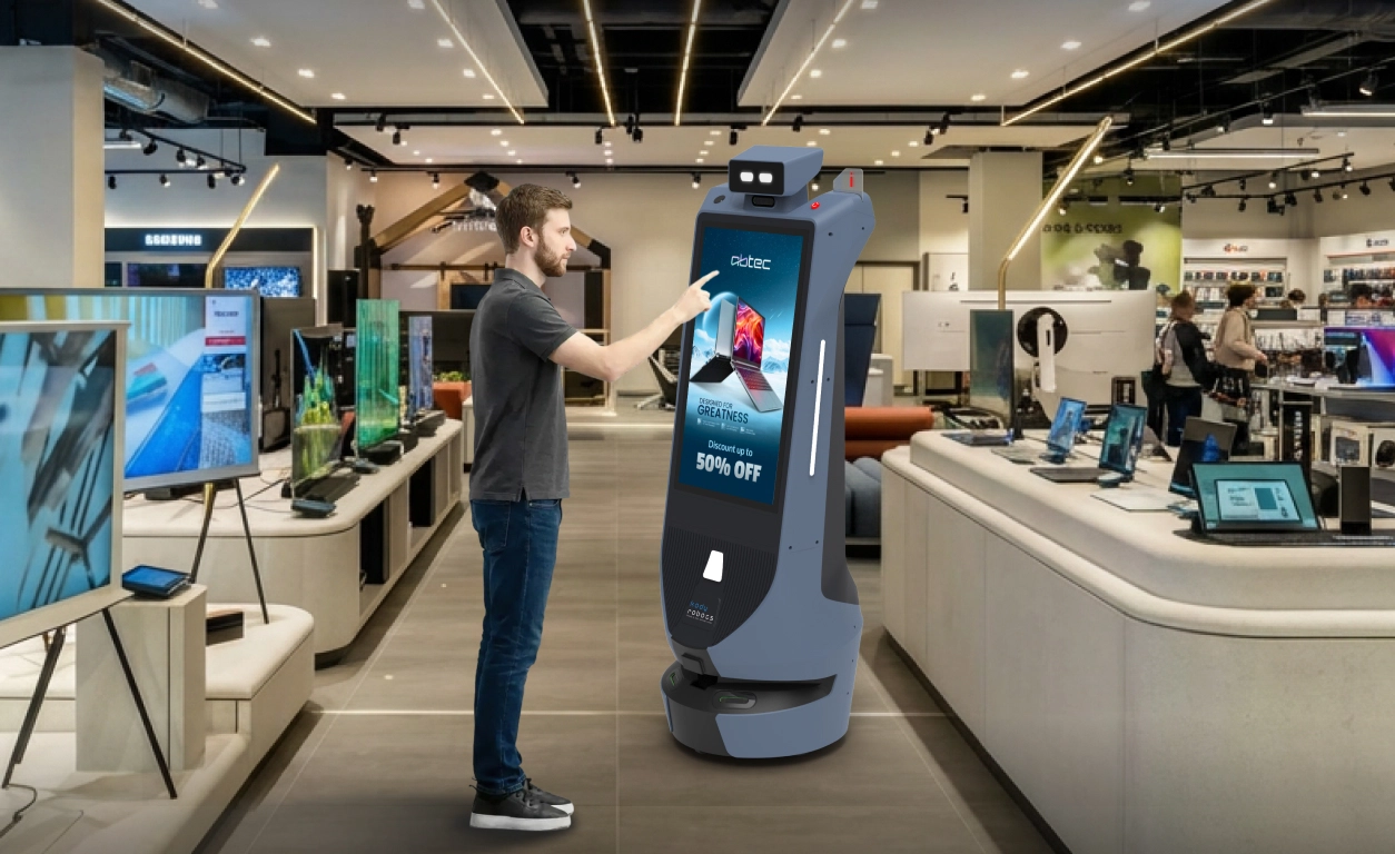 An electronics retail advertising robot increases visibility by carrying advertisements across the store instead of limiting exposure to a single location. This helps your advertising remain visible throughout customer movement inside the store.