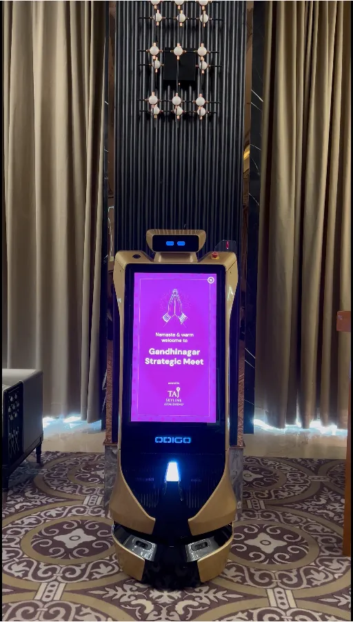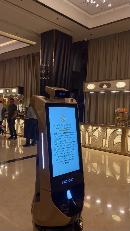 At the same time, Odigo, an AI-powered advertising robot, took on a different but equally important role. It moved through the event space as a mobile information center, greeting guests warmly, sharing event details, and providing information about Taj Skyline’s key personnel. Unlike traditional signage that guests might walk past, Odigo brought information directly to people wherever they were.