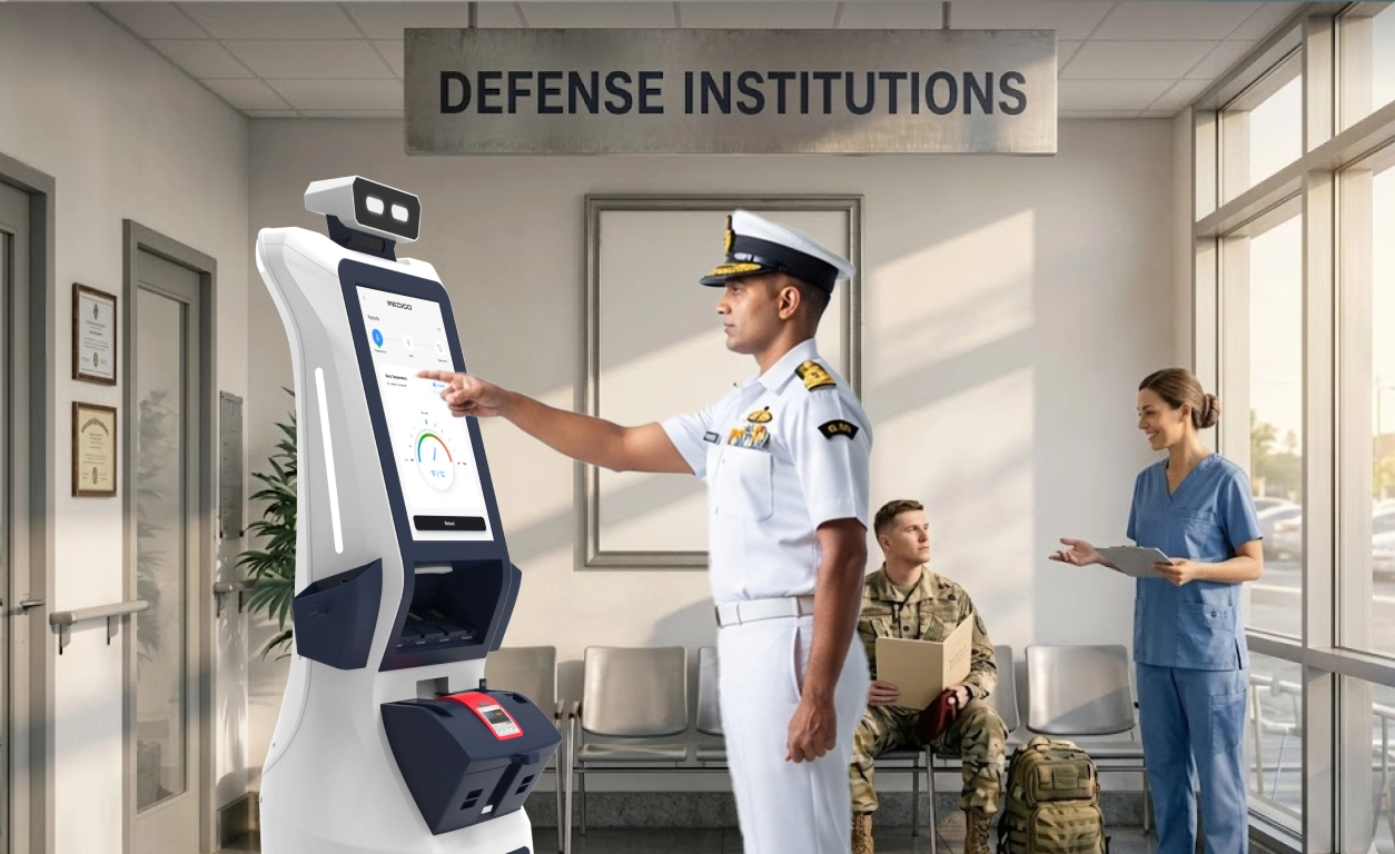 A Health Screening Robot for Defense Institutions like Medigo is an AI-enabled, on-demand health screening system that connects multiple diagnostic devices into one guided digital workflow. Medigo standardizes personnel health assessments from recruitment intake to periodic check-ups, generating consolidated digital reports in approximately 3 minutes per individual screened.